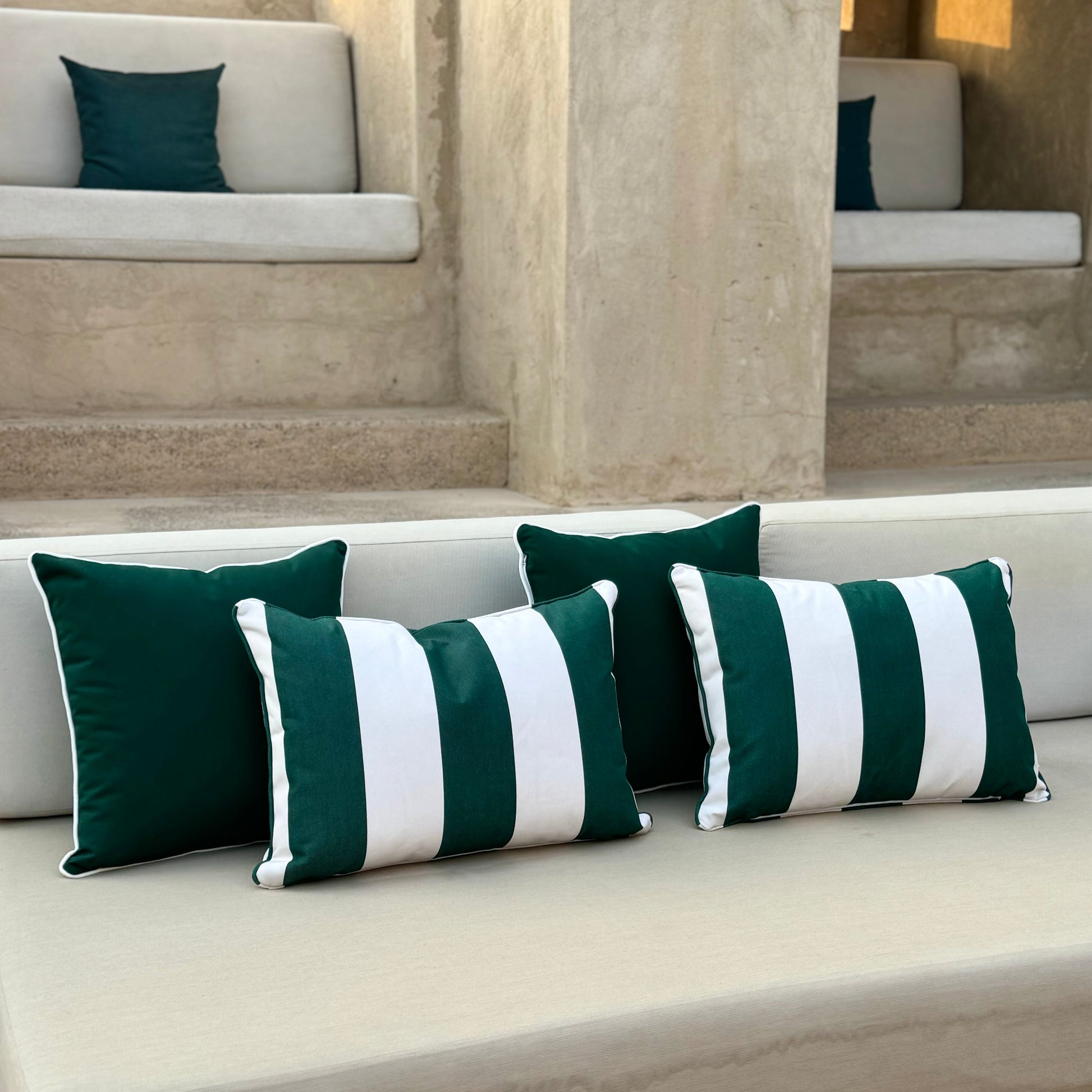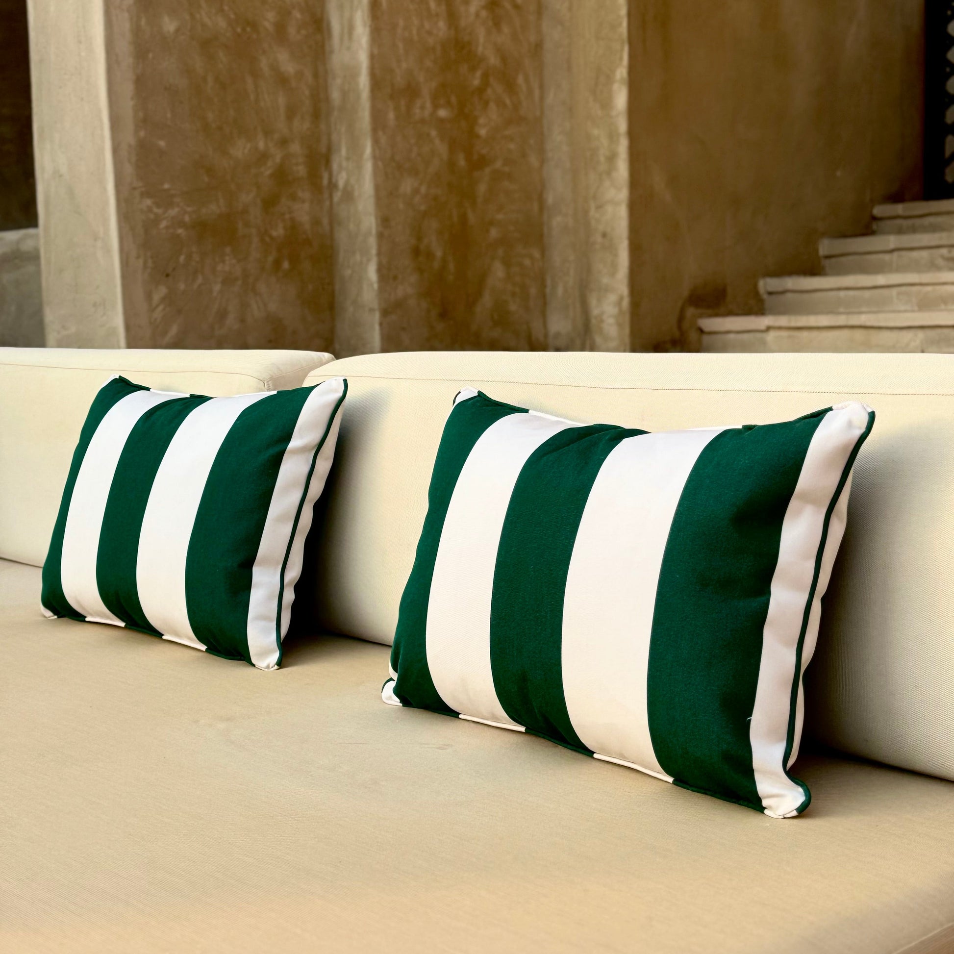 Verde Green striped outdoor cushion with piping. As seen at Bab Al Shams Resort. Each set includes 2 60cm cushions